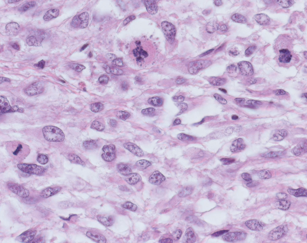 Spindelförmige pleomorphe Tumorzellen mit reichlich kompaktem eosinophilem Zytoplasma. Drei
