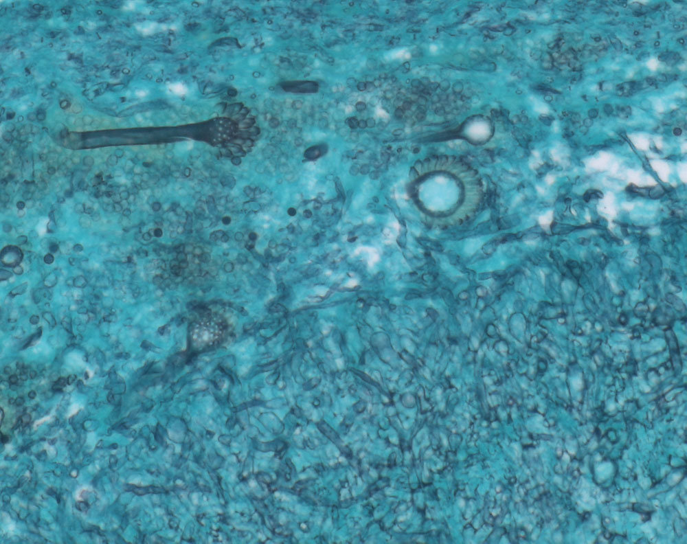 Ausschnitt aus dem Pilzball mit mehreren Fruchtköpfen (Conidiophoren) und aufgequollenen Aspergillushyphen.