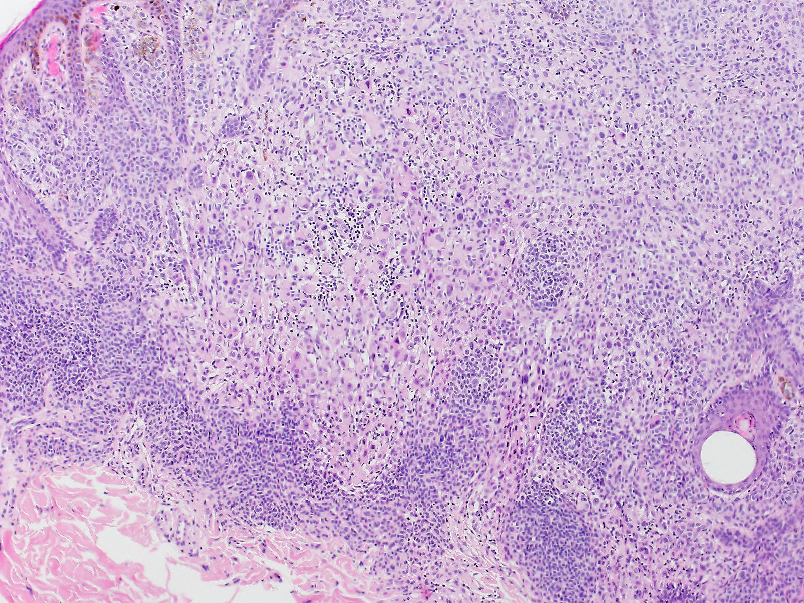 Biphänotypischer, überwiegend intradermaler Naevus mit einer kleinzelligen gewöhnlichen Naevuskomponente in den Randzonen und einer atypischen epitheloidzelligen Komponente. Die atypische Epitheloidzellkomponente besteht aus grossen Melanozyten mit reichlich glasigem Zytoplasma, klar definierten Zellgrenzen und grossen, vesikulären, leicht pleomorphen Zellkernen mit prominenten eosinophilen Nukleolen. Einige Zellen sind mehrkernig. An einigen Stellen sind reichlich tumorinfiltrierente Lymphozyten erkennbar.