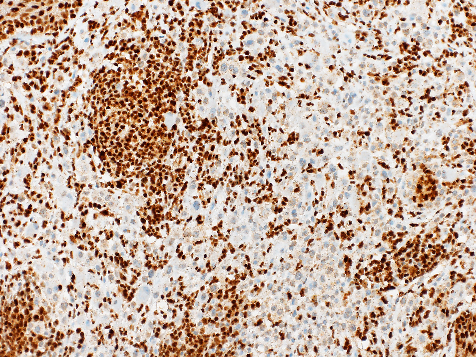 Die grossen epitheloiden Zellproliferate zeigen einen Verlust der BAP1 Expression im Zellkern. Die Zellkerne des gewöhnlichen Naevusanteils sind positiv. Beide Komponenten sind immunhistochemisch positiv für die BRAF V600E Mutation.