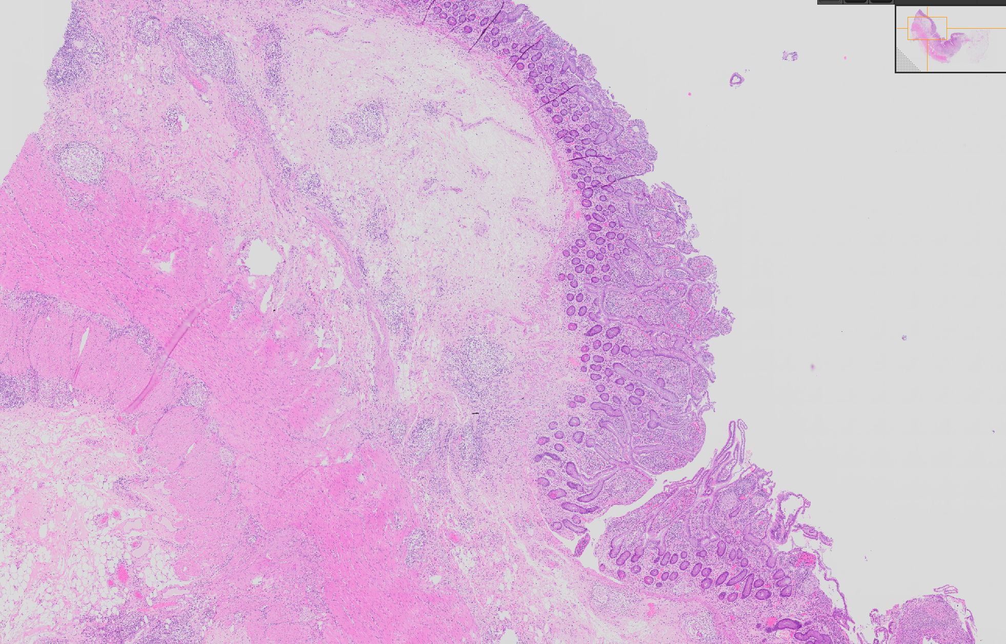 Abflachung der Dünndarmzotten oder Verplumpung der Dünndarmzotten (=Architekturstörung als Zeichen der Chronizität). Zahlreiche epitheloid-riesenzellige Granulome in allen Wandschichten.
