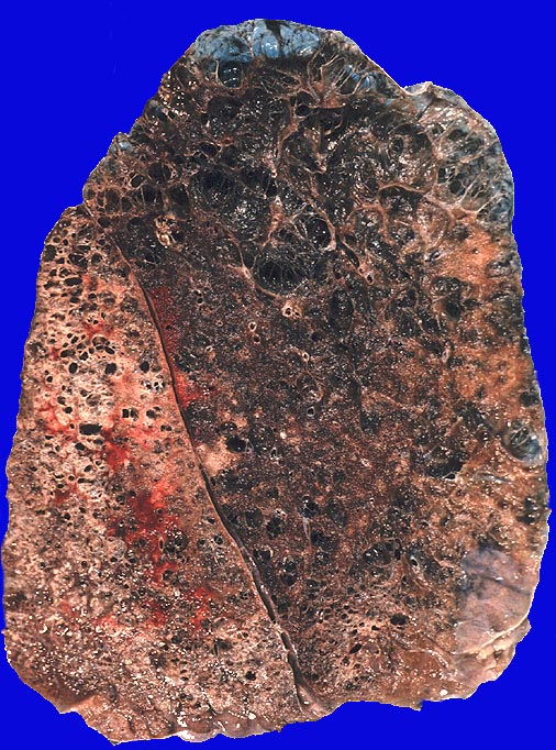 In den apikalen Abschnitten der Lungenlappen sind die Lungenstrukturen im Lobuluszentrum im Bereich der respiratorischen Bronchioli herdförmig abgebaut. Es sind unterschiedlich grosse Löcher erkennbar. In der Lungenspitze sind die Veränderungen so stark ausgeprägt, dass man vom Emphysem des leeren Lobulus sprechen kann. Nur noch Reste von entkapillarisierten Septen durchspannen den Hohlraum. Sogenanntes Emphysem des leeren Lobulus.
