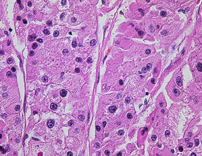 Trabekulär angeordnete leberähnliche Tumorzellen mit nur geringen Kernatypien.