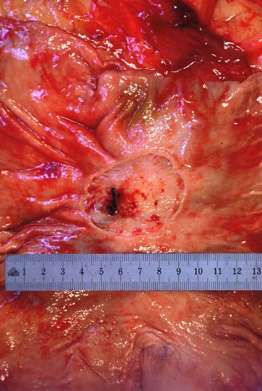4cm im Durchmesser messendes frisches Ulkus. Im Ulkusgrund ist eine arrodierte Arterie erkennbar.