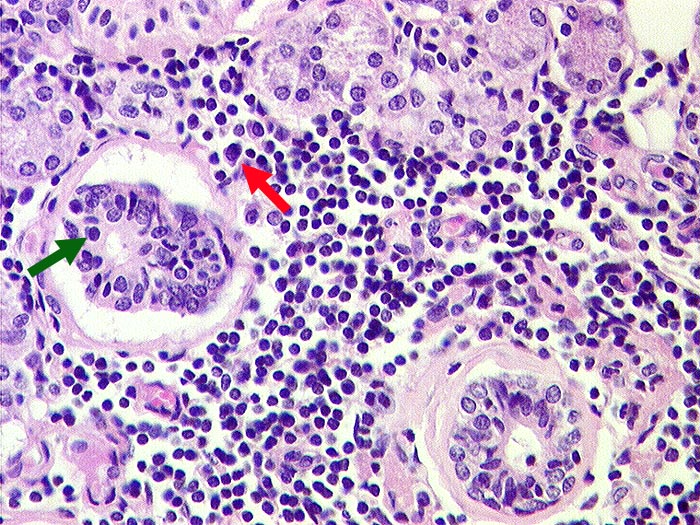 Entzündungsinfiltrat bestehend aus Lymphozyten und wenigen ► Plasmazellen. Einzelne ► Lymphozyten infiltrieren das Speicheldrüsenepithel.