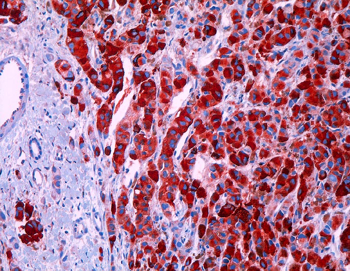 Starke zytoplasmatische Positivität der Tumorzellen für HMB-45.
