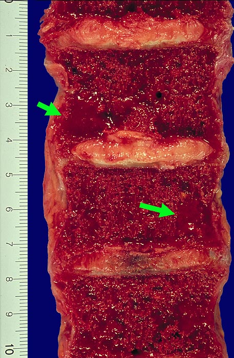 Osteolyseherde in den Wirbelkörpern.