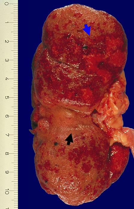 Neben ausgedehnten ► Narbenfeldern akute Pyelonephritis mit ausgedehnten, konfluierenden ► Eiterherden umgeben von einem hyperämischen Randsaum.