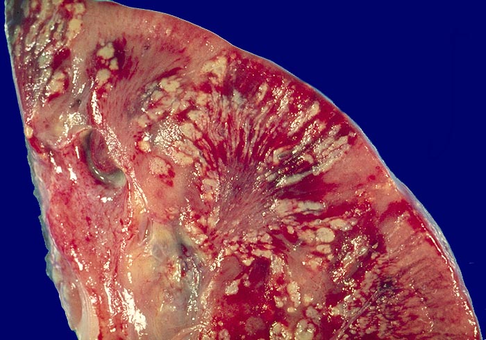 Das Nierenparenchym wird durchsetzt von Eiterherden und Eiterstrassen, die von der äusseren Rinde bis in die Papillenspitzen reichen. In der Umgebung besteht eine ausgeprägte Hyperämie. Nierenbeckenschleimhaut ebenfalls massiv hyperämisch bei schwerer Pyelitis.