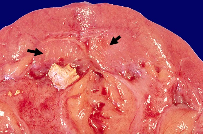 Im Nierenmark feinste weissliche ► Streifung. Im Nierenbecken multiple unterschiedlich grosse Konkremente und deutliche Hyperämie der Schleimhaut.