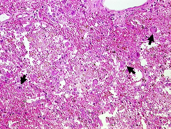 ► Virale Kerneinschlüsse mit Halo in Pneumozyten (sogenannte Eulenaugenzellen). Intraalveoläre Hämorrhagie.