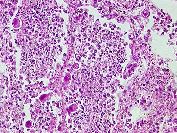 Virale Kerneinschlüsse mit Halo in Pneumozyten (sogenannte Eulenaugenzellen). Intraalveoläre Granulozyten bei zusätzlicher bakterieller Pneumonie.