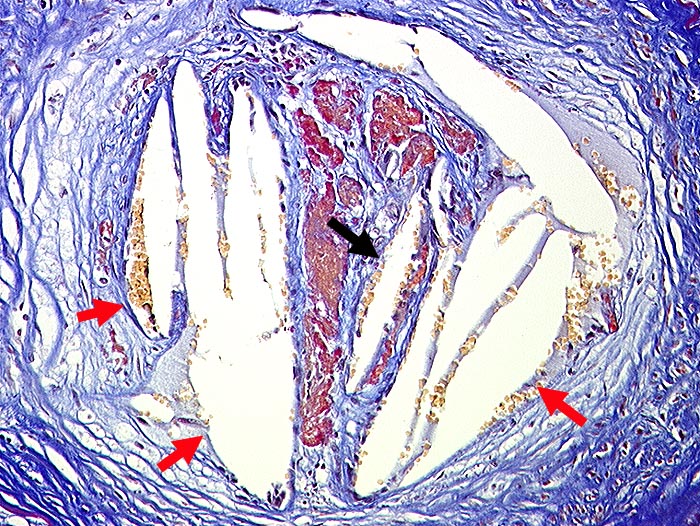 Durch die Fixation herausgelöste ► Cholesterinkristalle sind als wetzsteinförmige Hohlräume im Gefässlumen sichtbar. ► Eine ältere Embolie ist umgeben von Bindegewebe.