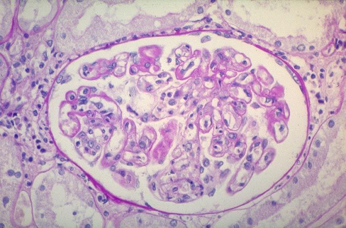 Das Mesangium ist nicht sklerosiert. Im Mesangium leichte Zellvermehrung. In den peripheren Schlingen dünne Proteinablagerungen. In den Schlingenlumina vermehrt mononukleäre Zellen und einzelne gelapptkernige Leukozyten.