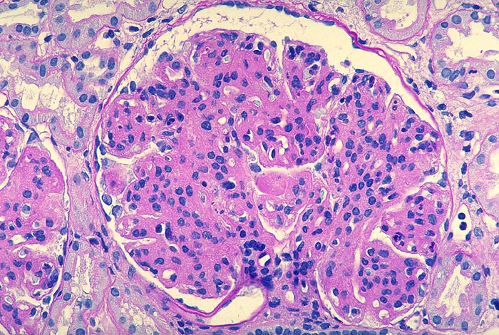 Initial finden sich in den Schlingen subendotheliale Immundepots begleitet von gelapptkernigen Leukozyten und Monozyten. Mit Abnahme der endokapillären Hyperzellularität kommt es zu einer mesangialen Zellproliferation mit Auswandern der Mesangiumzellen in die Peripherie und Neubildung einer Basalmembran (mesangiale Interposition). Schliesslich verschwinden die subendothelialen Depots, die neugebildete Basalmembran wird dicker, die Mesangiumzellzahl nimmt ab und die mesangiale Sklerose zu.