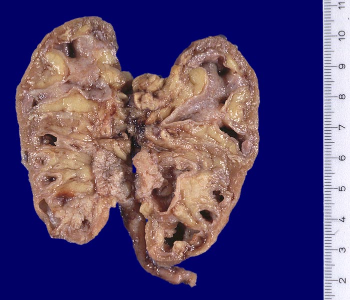 Blasse Schrumpfniere. Die blassen Papillen sind nekrotisch und in situ verblieben. Vakatwucherung des Nierenbeckenfettgewebes. Papillärer Tumor im ausgeweiteten Nierenbecken des Unterpols.