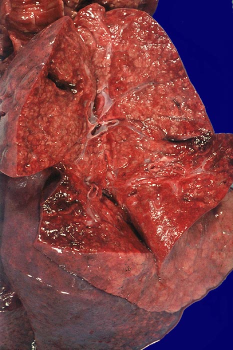 Die Lungenschnittfläche ist grobhöckrig aufgrund zahlreicher weissgrauer, erhabener miteinander konfluierender pneumonischer Infiltrate.