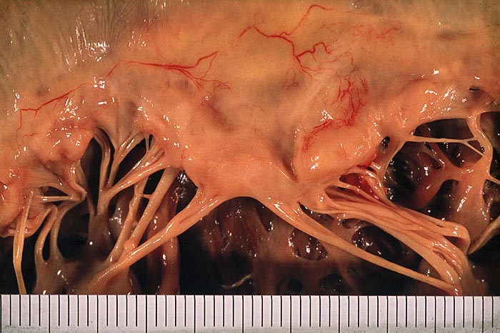 Die Sehnenfäden der Mitralklappe sind deutlich verdickt und teilweise miteinander verwachsen. Zahlreiche Neovaskularisationen im Klappengerüst.