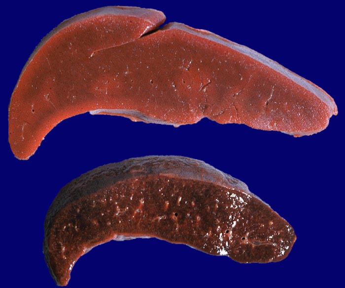Schinkenmilz bei Amyloidose (oben), Normalbefund (unten)