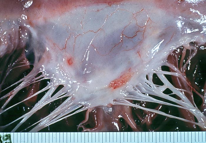 Leicht verdickte Sehnenfäden und Gefässeinsprossungen im Klappengerüst zeugen von einer abgelaufenen Endokarditis. Zusätzlich finden sich frische winzige verruköse Auflagerungen auf der Klappe.