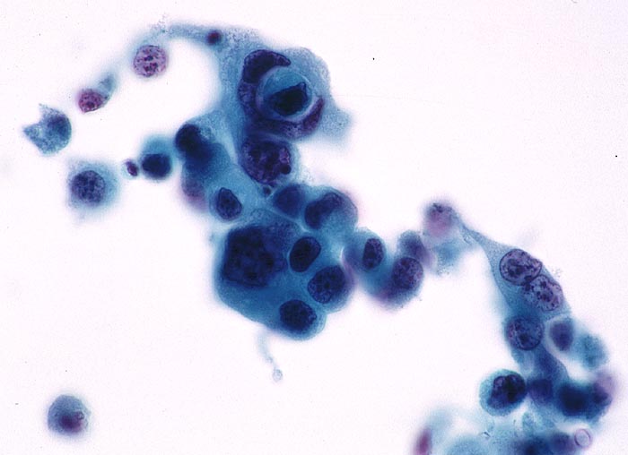 Zahlreiche hochgradig atypische Urothelien mit ausgeprägter Kernvergrösserung und starker Kernpolymorphie.
