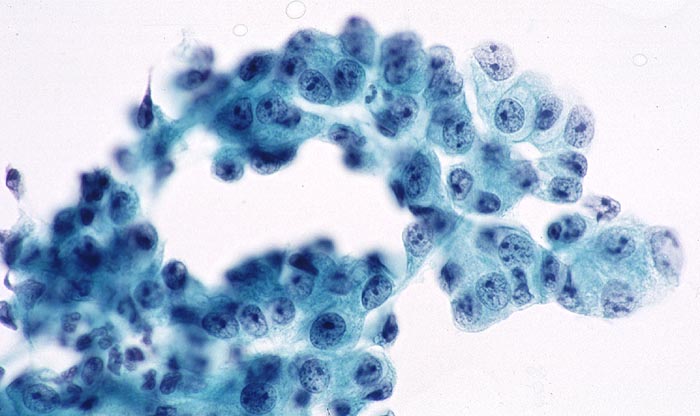 Verband atypischer Zellen. Diese besitzen etwas unterschiedlich grosse, teilweise entrundete, grob strukturierte Kerne mit 1 oder mehreren basophilen Chromozentren. Der Zytoplasmaleib ist fein zyanophil granular bis angedeutet fein vakuolär .