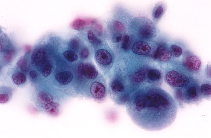 Der Ausstrich enthält zahlreiche hochgradig atypische Urothelien im Verband mit ausgeprägter Kernvergrösserung und starker Kernpolymorphie sowie mit hoher Kernplasmarelation.