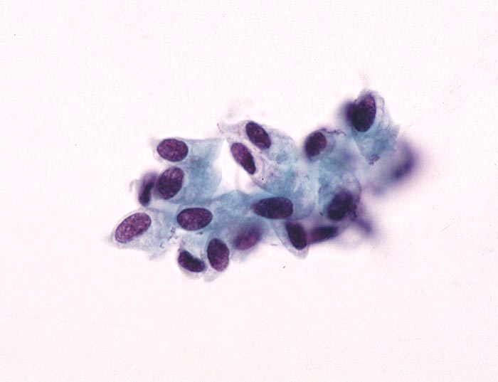 Vereinzelt Urothelzellen mit leichten Kernatypien. Die Atypien könnten zu einer Urotheldysplasie passen.