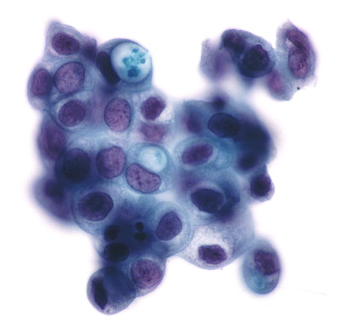 Urothelzellen mit Kernatypien. die Atypien reichen zur Diagnose eines invasiven Karzinoms nicht aus, passen aber zu Urothelpapillom mit Epithelatypien.