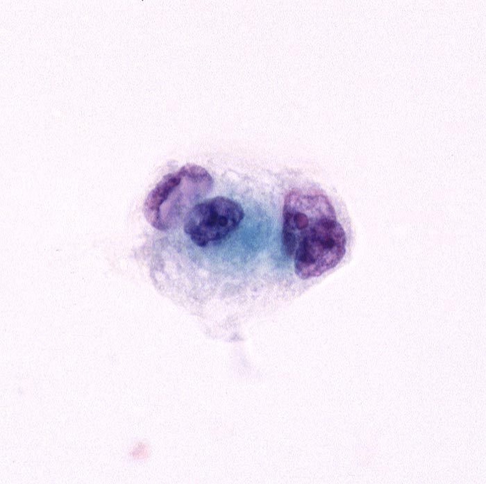 Ggrossleibige Zellen mit grobstrukturiertem Kern und auffallend plumpen Nukleolen. Der Zytoplasmaleib ist abgerundet und schaumig strukturiert .
