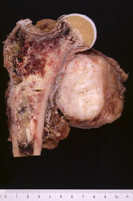 Femurresektionsrand entfernt und bis in die Markhöhle des Kopfes ausgefüllt von einem knochenharten, weissgelblichen, zum Teil landkartenartig hämorrhagisch durchsetzten, 'bunten' Tumor.