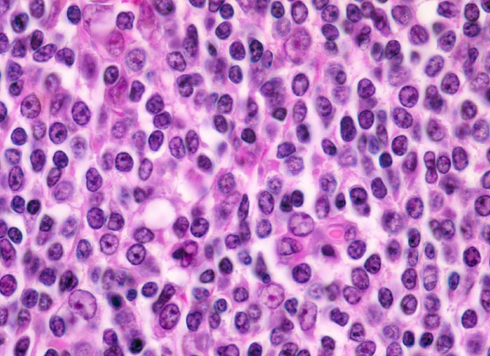 Das neoplastische Infiltrat besteht aus kleinen zentrozytoiden Zellen mit leicht entrundeten Kernen und wenig Zytoplasma. Eingestreut einzelne