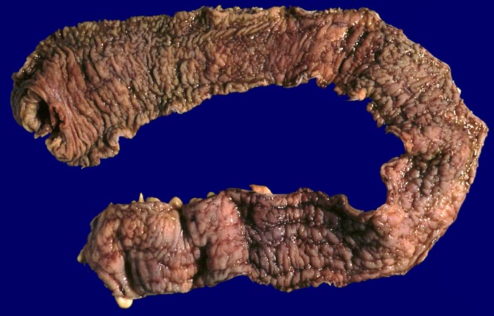 Totales Kolektomiepräparat mit diffus veränderter Schleimhaut. Längsgerichtete Ulkusstrassen mit Querverbindungen ergeben ein pflastersteinartiges Relief. Im Gegensatz zum Morbus Crohn kein segmentaler, sondern diffuser Befall und keine Verdickung der Darmwand.
