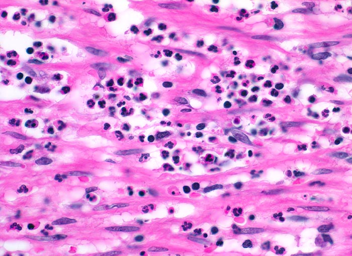 Die glatte Muskulatur der Appendixwand wird diffus infiltriert von neutrophilen Granulozyten.
