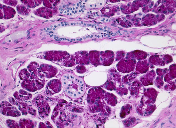 Die Acini der rein serösen Speicheldrüse bestehen aus einem Zelltyp mit feingranulärem PAS positivem Zytoplasma. Zwischen den Drüsenacini liegen