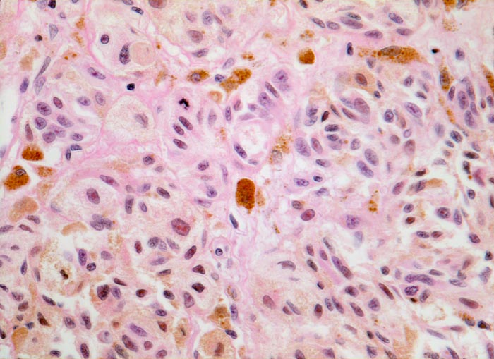 Atypische pigmentierte Zellen mit reichlich Zytoplasma und vergrösserten atypischen Kernen mit prominenten eosinophilen Nukleolen. Mitose. Zwischen den Tumorzellen Melanophagen mit grobgranulärem intrazytoplasmatischem Pigment.