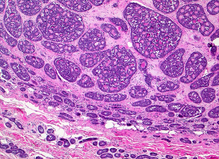Die einzelnen Tumorzellaggregate sind scharf begrenzt, teils solide und teils kribriform (siebartige Struktur). Die Hohlräume entsprechen nicht Drüsenlumina, sondern haben Kontakt zum Stroma, was besonders am Rand der kribriformen Strukturen erkennbar ist.