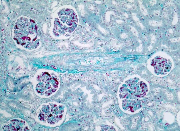 Die Glomerulumkapillaren sind angefüllt mit roten wurmförmigen Fibrinthromben. In der kleinen Arterie in der Bildmitte hingegen kein Nachweis von thrombotischem Material.