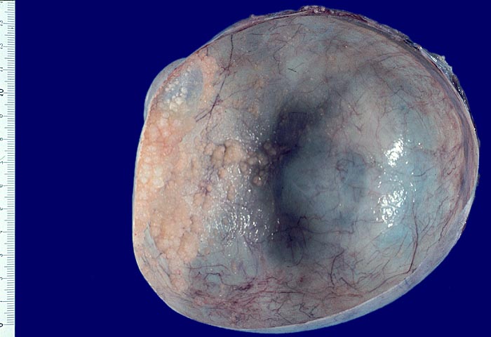 Unilokuläre Zyste mit glatter Oberfläche. Zysteninnenauskleidung mit fokalen papillären Knötchen.