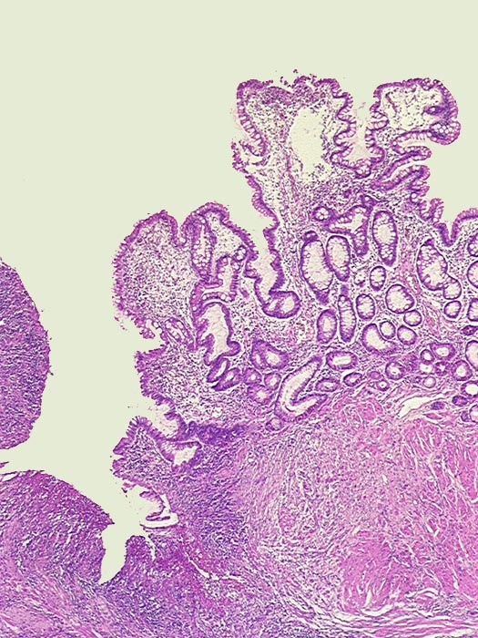 Links das tiefreichende Ulkus. Rechts davon hyperplastische Dünndarmschleimhaut (makroskopisch Pflastersteinrelief).