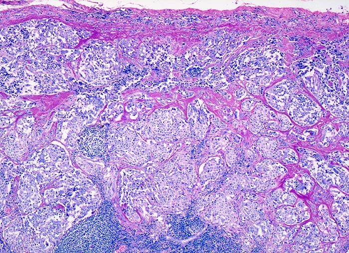 Spärlicher Reste von lymphatischem Gewebe unten im Bild. Tumorinfiltrat aus soliden monomorphen Zellballen umgeben von breiten Sklerosesepten.