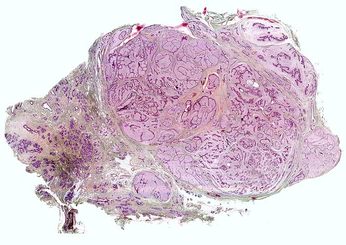 Rechts im Bild ein scharf begrenzter lobulierter Tumor. Die einzelnen Knoten bestehen aus bäumchenartig oder hirschgeweihartig verzweigten Drüsenschläuchen umgeben von hellem zellarmem Stroma.
