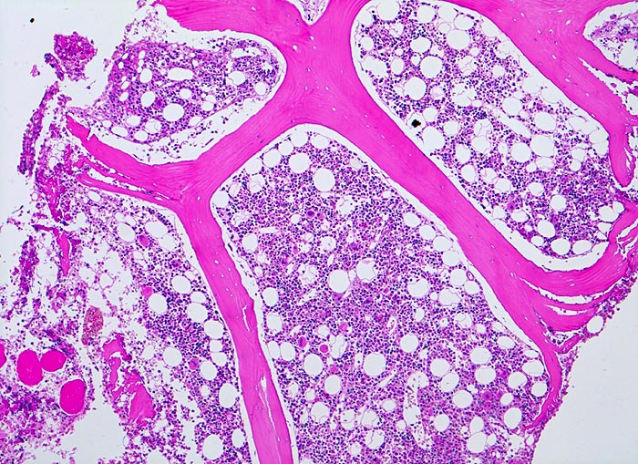 Das Verhältnis von blutbildendem zu Fettmark ist etwa ausgeglichen und entspricht einem normozellulären Mark bei einem 50 jährigen Patienten. Unauffällige Spongiosabälkchen. Geringe Vermehrung der Megakaryozyten.