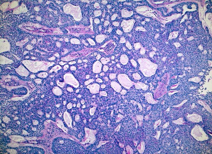 Das Basalzellkarzinom zeigt innerhalb solider monomorpher Zellplatten zahlreiche an Drüsen erinnernde Hohlraumbildungen ähnlich einem adenoidzystischen Karzinom. In den Randbereichen der Zellplatten ist die typische Palisadierung der Tumorzellen erkennbar.