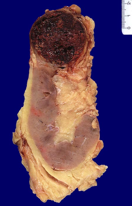 Im Nierenunterpol ein runder 5,2cm im Dm messender stark hämorrhagischer und nekrotischer braun-roter Tumorknoten. Der Tumor zeigt keinen Bezug zum Nierenbecken. Die Nierenkapsel scheint intakt.