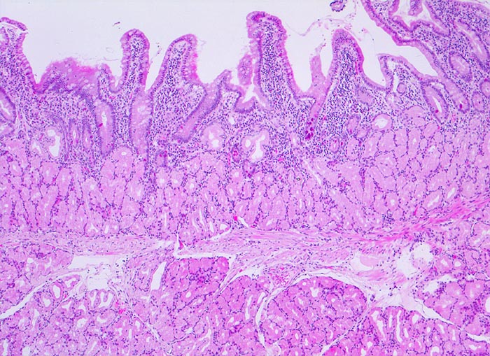 Bulbus duodeni mit relativ plumpen Zotten und hellen Brunner'schen Drüsen in Mukosa und Submukosa
