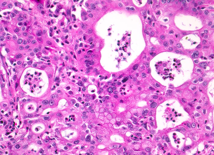 Maligne Tumordrüsen liegen dos à dos und bilden ein kribriformes (siebartiges) Muster. Die Zellkerne sind polymorph, das Chromatin ist vergröbert. Die Lumina der Tumordrüsen sind angefüllt mit neutrophilen Granulozyten.