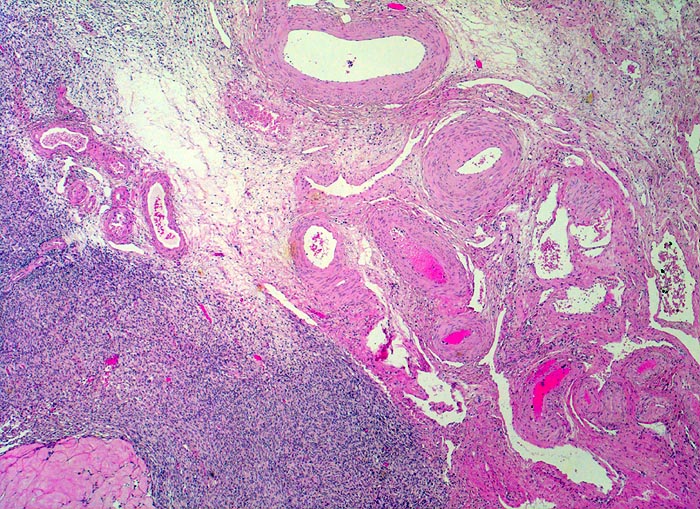 Rechts oben im Bild zahlreiche dickwandige Gefässe des Ovarhilus in lockerem Stroma eingebettet. Links unten im Bild Anschnitt eines Corpus albicans.