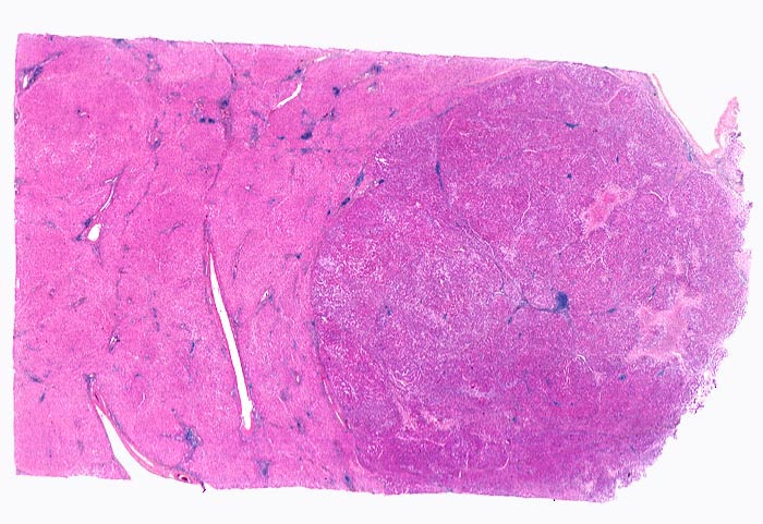 Das Leberparenchym links im Bild zeigt entzündlich infiltrierte und fibrosierte Portalfelder als Folge der chronischen Hepatitis C. Der scharf begrenzte Tumor rechts im Bild ist aufgrund der höheren Kern-Zytoplasmarelation dunkler gefärbt. Im Tumor finden sich lediglich Arterien, aber keine Portalfelder. Fokale Tumornekrosen und intratumorale Entzündungsinfiltrate.