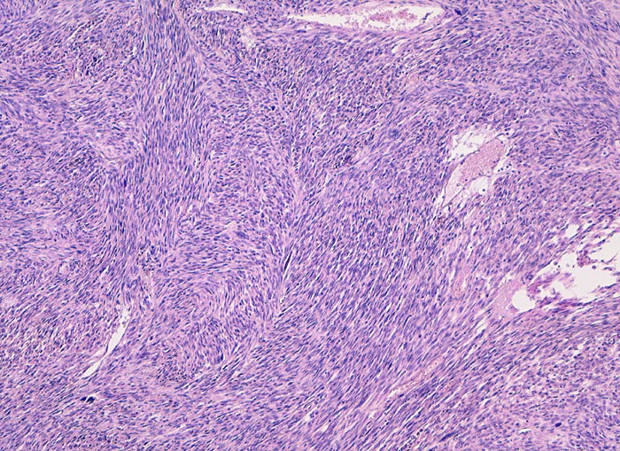 Dicht gelagerte spindelige Zellen mit länglichen Kernen sind in sich durchflechtenden Bündeln angeordnet. Im Vergleich zum Leiomyom grössere und polymorphere dichter gelagerte Kerne.